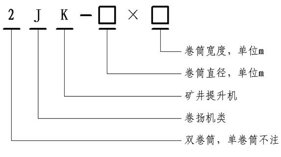 1:卷筒直徑為2.5m、寬度為2.0m的單卷筒盤閘式單繩纏繞式礦井提升機(jī)型號(hào)為:JK2.5×2;